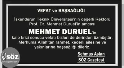 İskenderun Teknik Üniversitesi(İSTE) Rektörü Mehmet Duruel’in Amcası Mehmet Duruel, önceki gün geçirdiği kalp krizi sonrası...